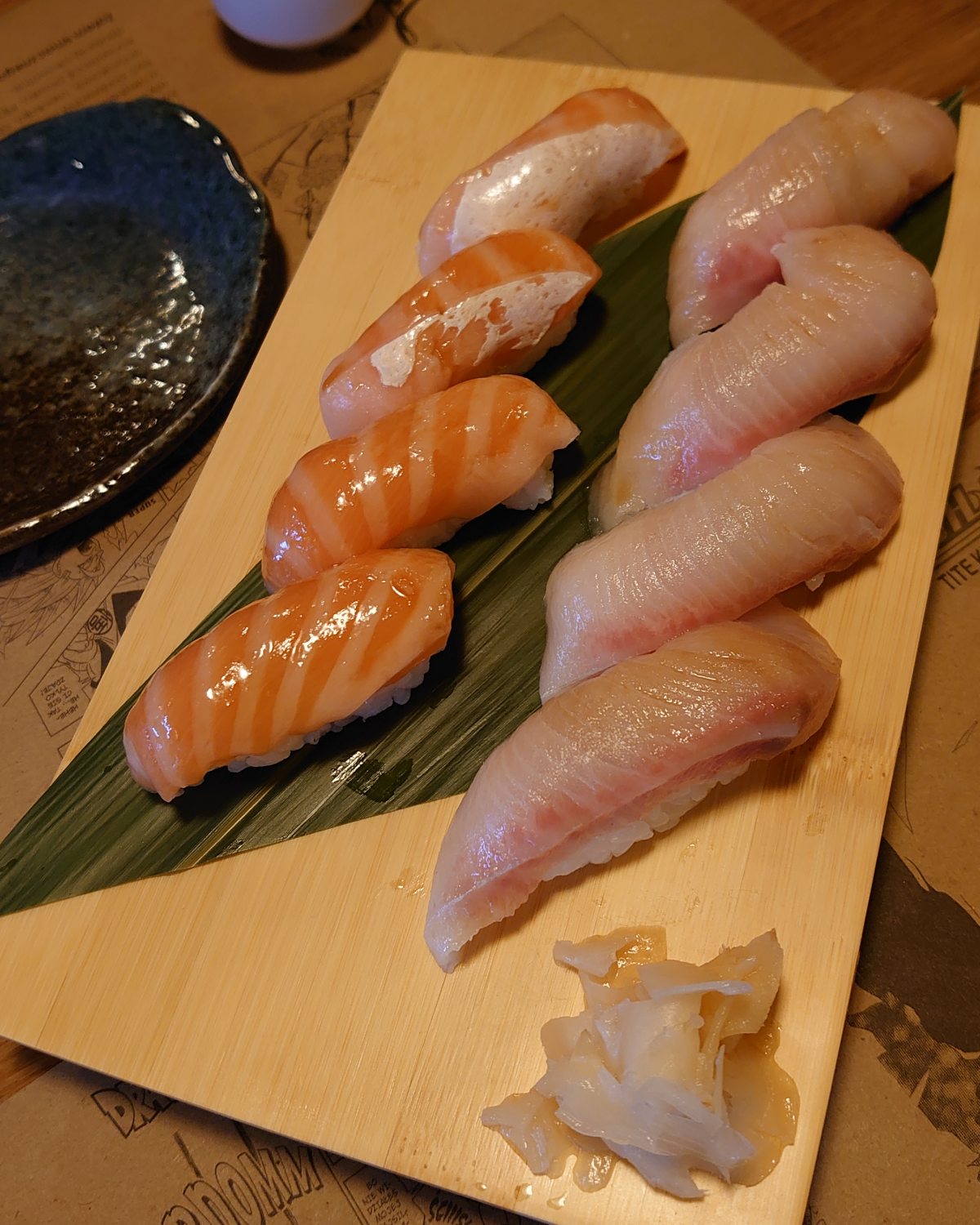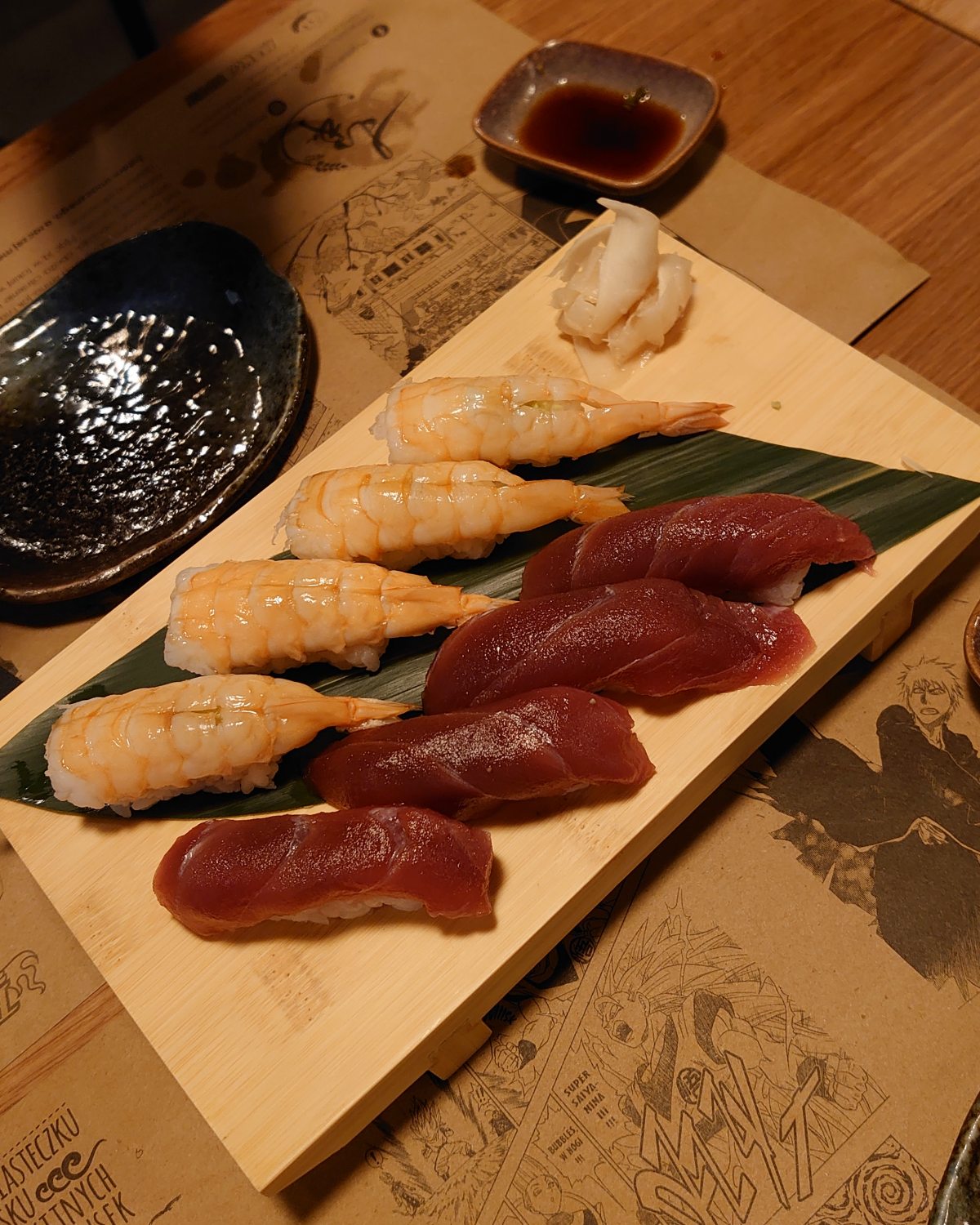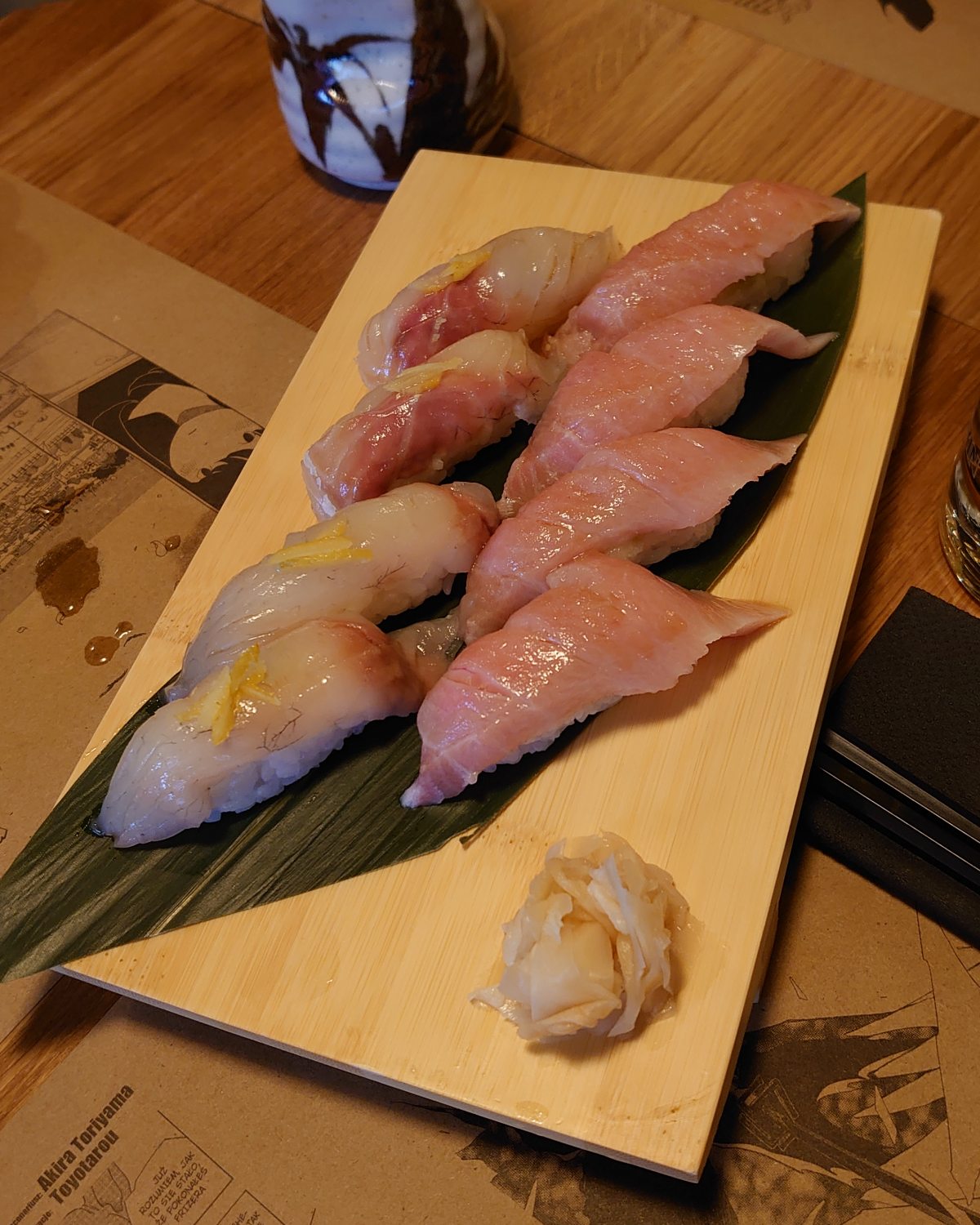 Aha, między poszczególnymi kawałkami z różnymi dodatkami warto przekąsić płatek marynowanego imbiru – odświeża smak.